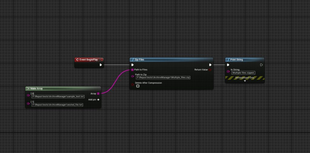 bool Success = UArchiveManagerBPLibrary::ZipFiles(FilesToCompress, OutputZip, DeleteOriginals);